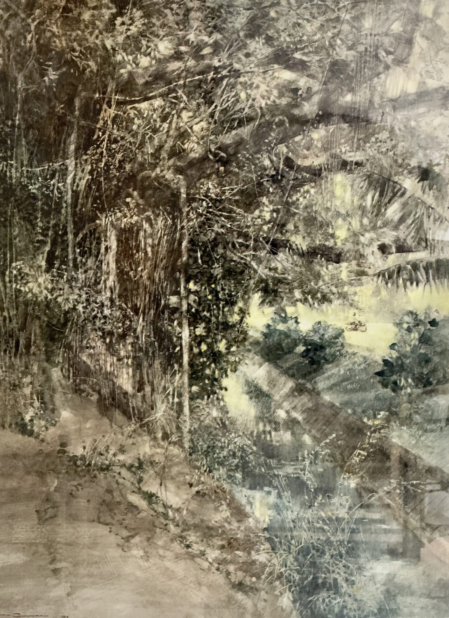 Working primarily in watercolor and acrylic, Wan achieves refined tonal harmony and remarkable textural depth. His palette is subtle and elegant, built through meticulous layering and delicate brushwork. Techniques such as monochromatic gradation and softened strokes create a profound sense of atmosphere and emotional resonance. His visual language is understated yet powerful, balancing stillness and movement to evoke both vitality and introspection.